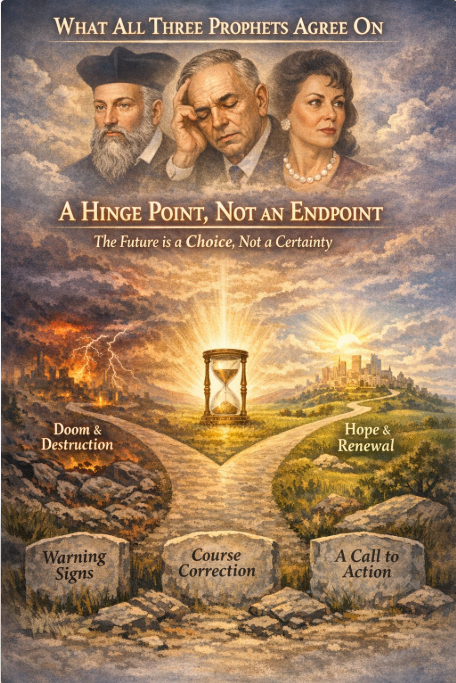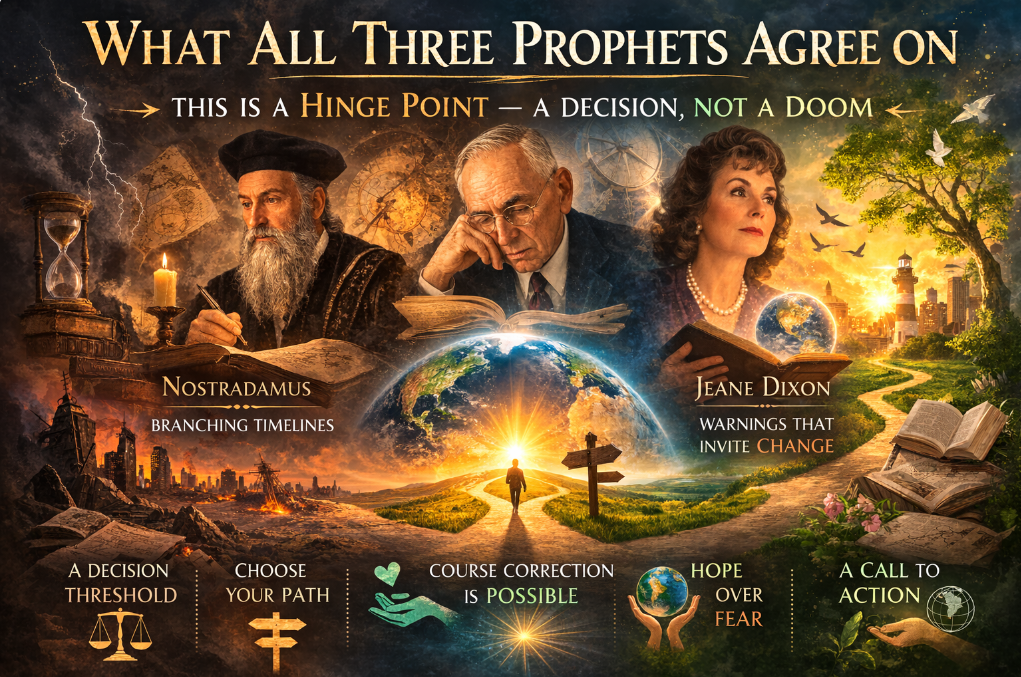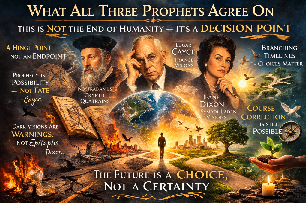 First: A hinge point, not an endpoint. All three prophets treat this period as a decision threshold rather than a predetermined doom. Cayce stated explicitly that prophecy represents possibility, not fate. Nostradamus structured his writings around branching timelines. Dixon framed her darkest visions as warnings that invited course correction. None of them wrote an epitaph for humanity. All three wrote an urgent summons.