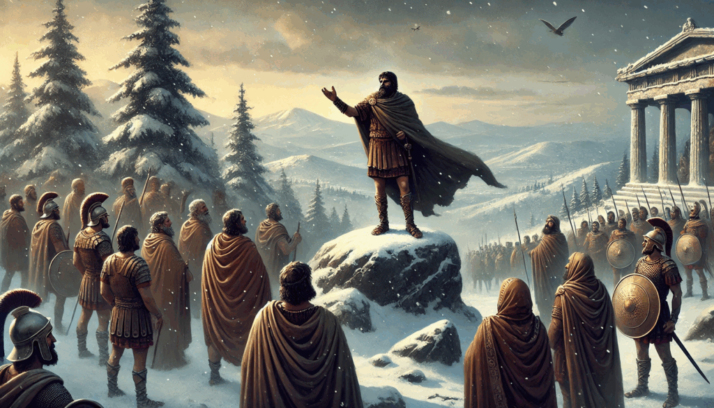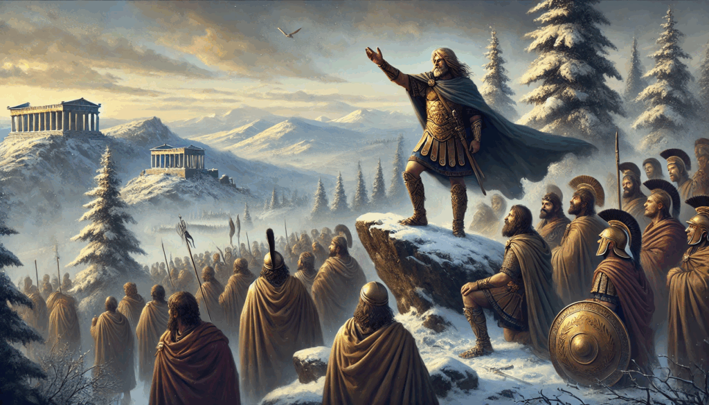 In the frozen highlands above Athens, Thrasybulus rallies exiles and allies with fiery resolve. Snow and stone surround the fortress, but the leader’s voice burns with the promise of democracy’s return.