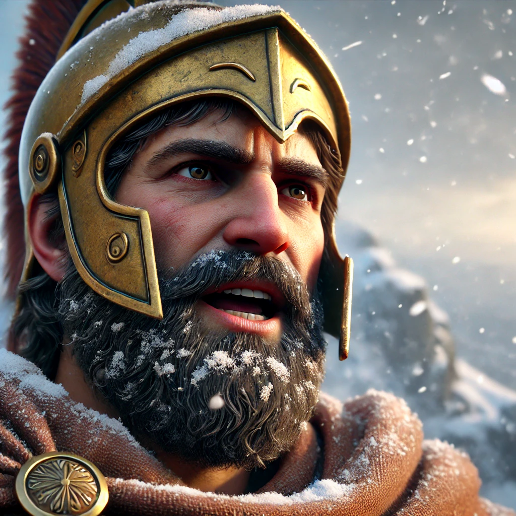 With snow on his cloak and fire in his voice, Thrasybulus speaks not just to men but to history. His steady gaze and battle-worn face reveal the weight of what’s at stake — the rebirth of Athenian freedom.