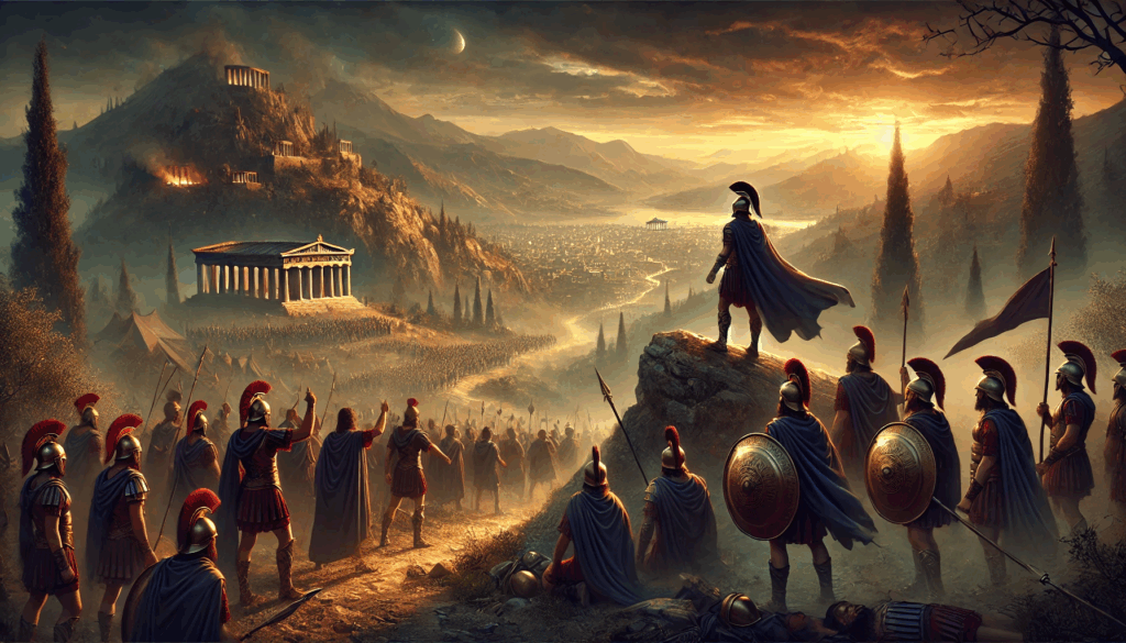 With Athens glowing on the horizon, Thrasybulus rallies his exiles atop the high ground. Bronze helms glint in the dawn; capes flow in the wind — the return of democracy begins not with swords but with resolve.