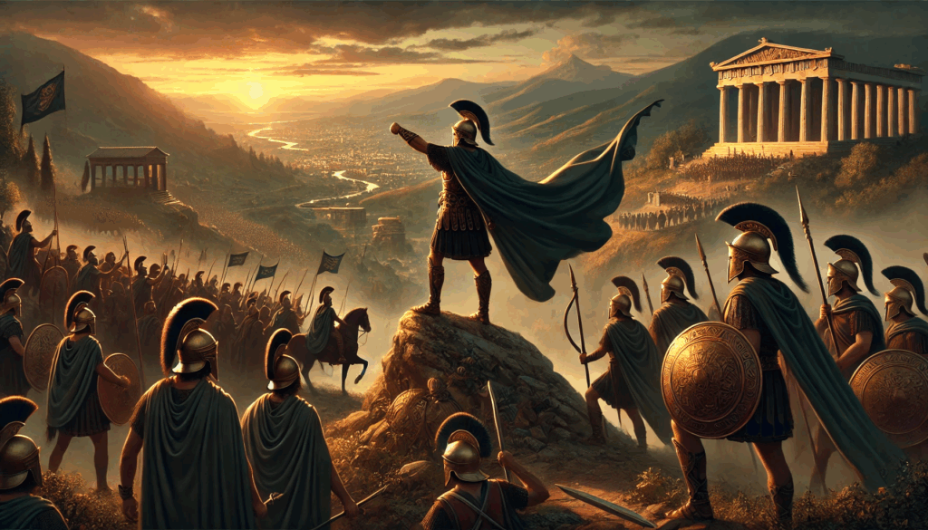 Bathed in golden light, Thrasybulus stands above a peaceful Athens, his eyes fixed on the horizon. Cloaked in honor and history, he symbolizes the return of freedom — a warrior not just of war but of vision, principle, and enduring civic hope.