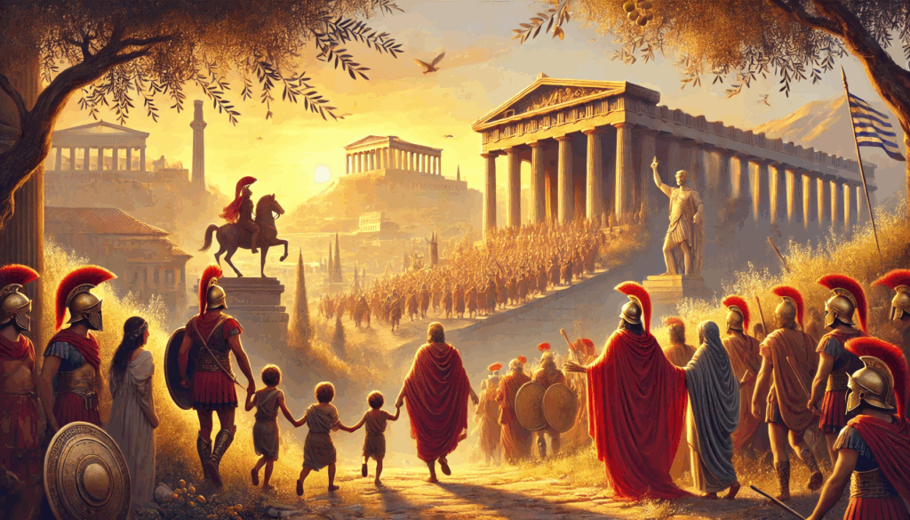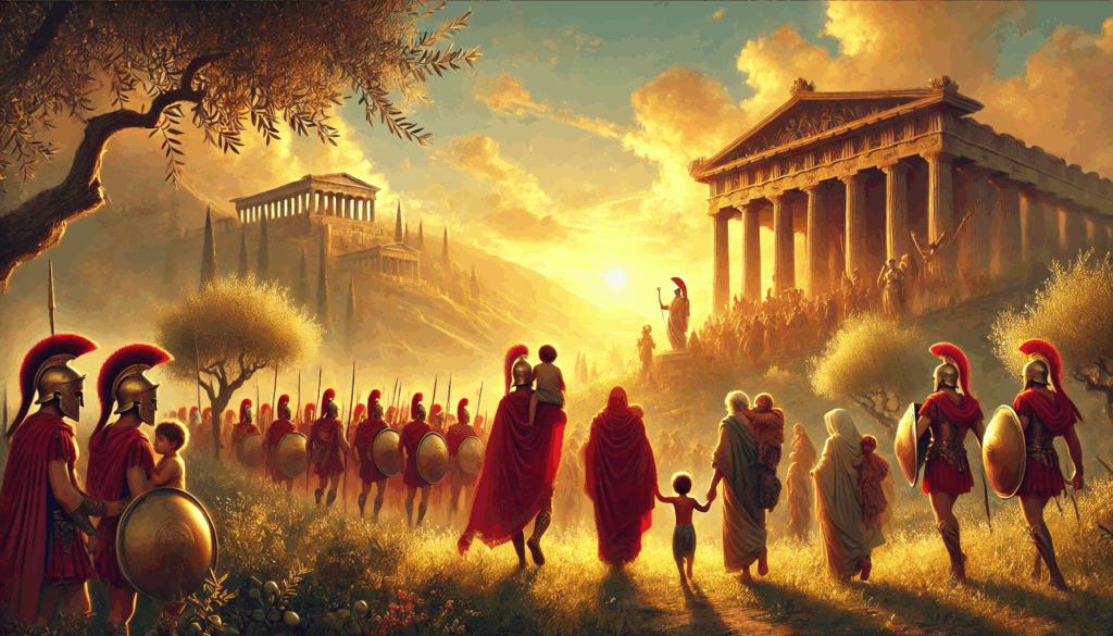 Spartan soldiers march quietly out of Athens as golden light pours over olive trees and marble columns. Citizens, children, and elders return through the same gates — not as soldiers, but as free Athenians. Above them, the Parthenon watches like a guardian reborn.
