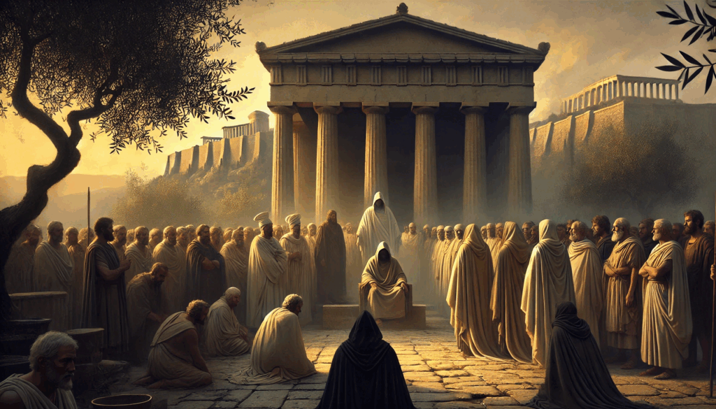 In the sacred courtyard of Eleusis, cloaked figures — the last of the Tyrants — await judgment. Surrounded by Athenian citizens in quiet robes, they face not swords but the heavy silence of justice. The olive branches overhead and fading light speak to endings and reckonings.