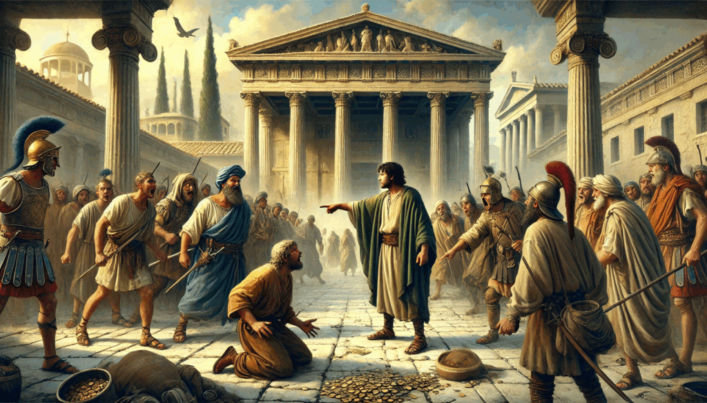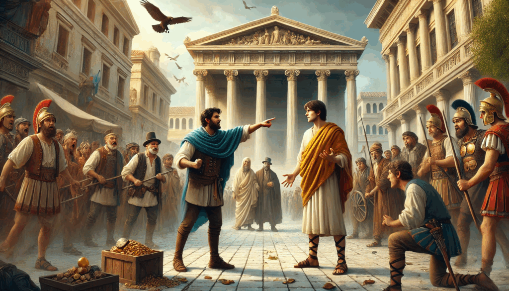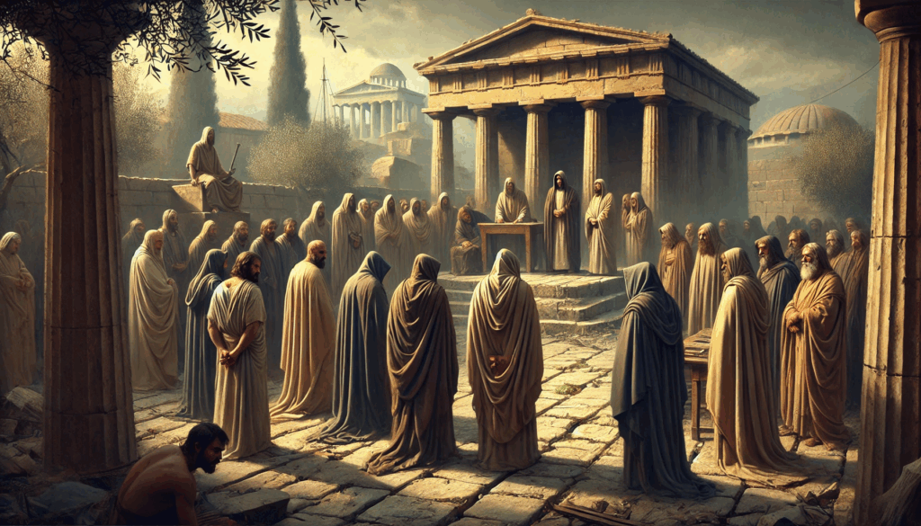 Beneath the columns of Eleusis, those who ruled through fear now stand humbled before the people. No weapons are drawn, yet the mood is tense — a silent verdict looms. This is how Athens ends tyranny: not with vengeance but with memory, witness, and resolve.