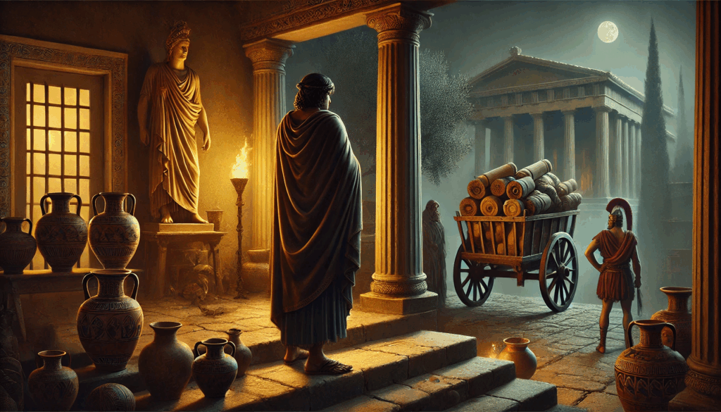 One of the Thirty Tyrants orders the confiscation of a foreign resident’s home while guards carry out the theft. In the distance, families escape Athens — a city turning against those who made it thrive.