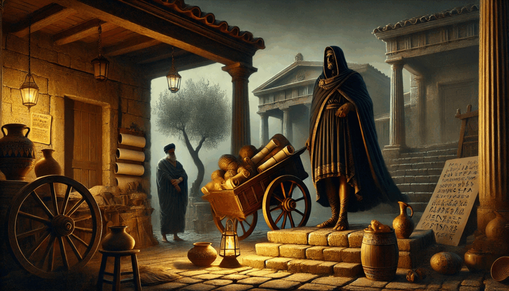 On a terrace lit by torchlight, a lone Tyrant surveys his spoils — scrolls, pottery, stolen livelihoods — as the man who once owned them watches from the shadows. No sword is drawn, but everything is taken.