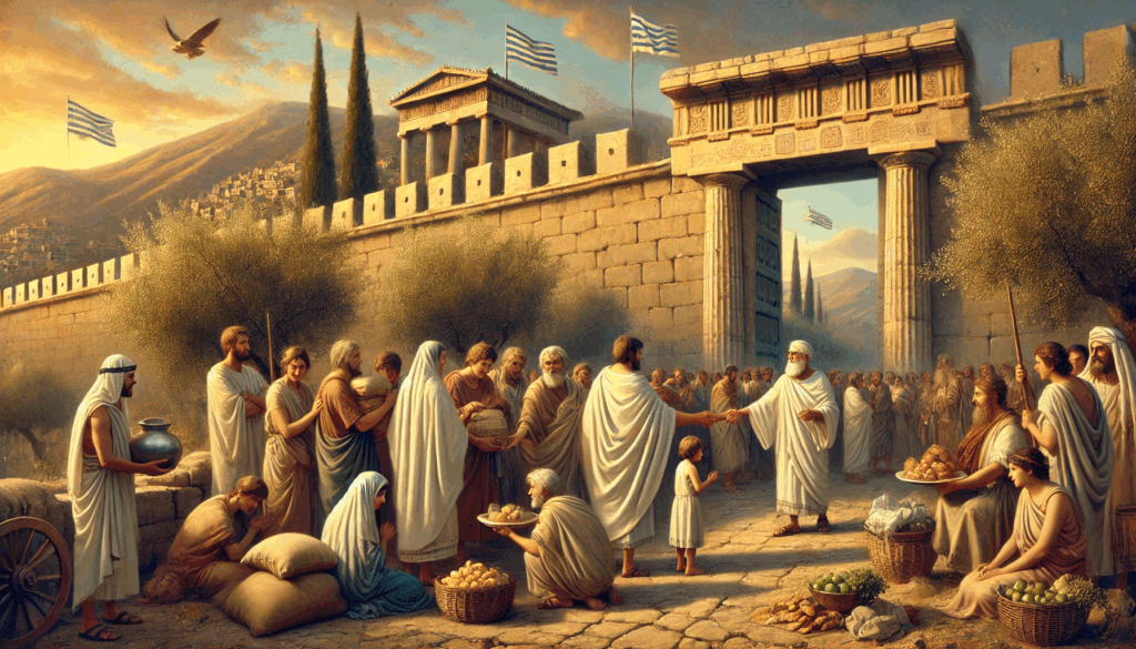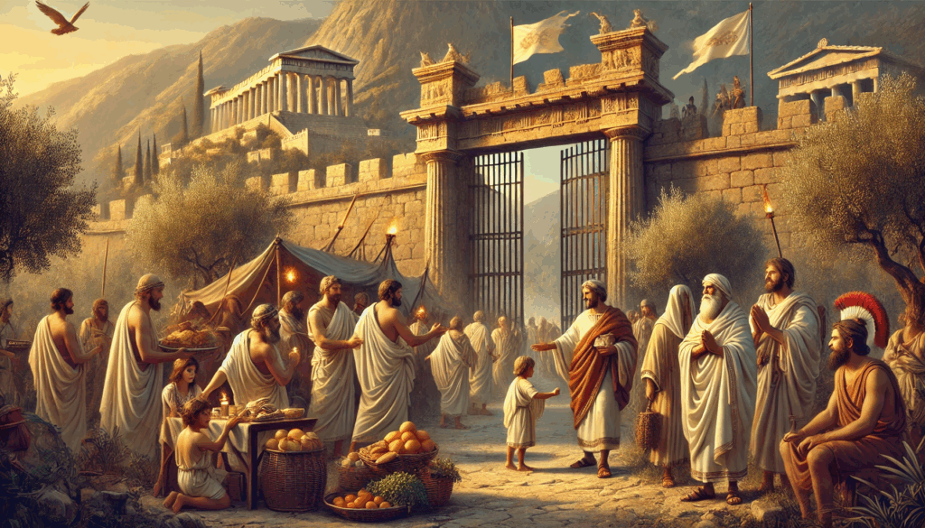 At the edge of Boeotia, Theban citizens welcome weary exiles from Athens with open hands and quiet strength. Bread is shared, cloaks are offered, and behind the gates, democracy’s defenders find rest and resolve.