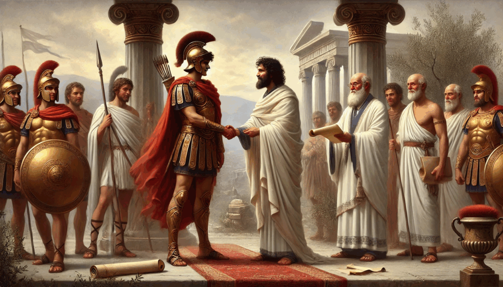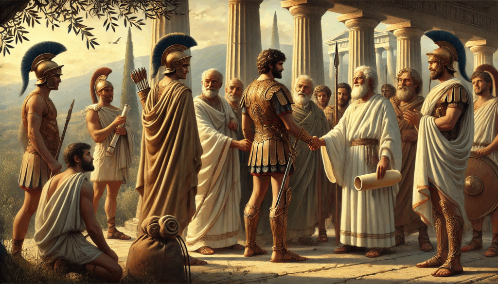 Thrasybulus meets the gaze of a Theban leader as their hands clasp in quiet defiance of tyranny. The resolve in their faces reflects a shared purpose — that Athens must be free again, and Thebes will help make it so.