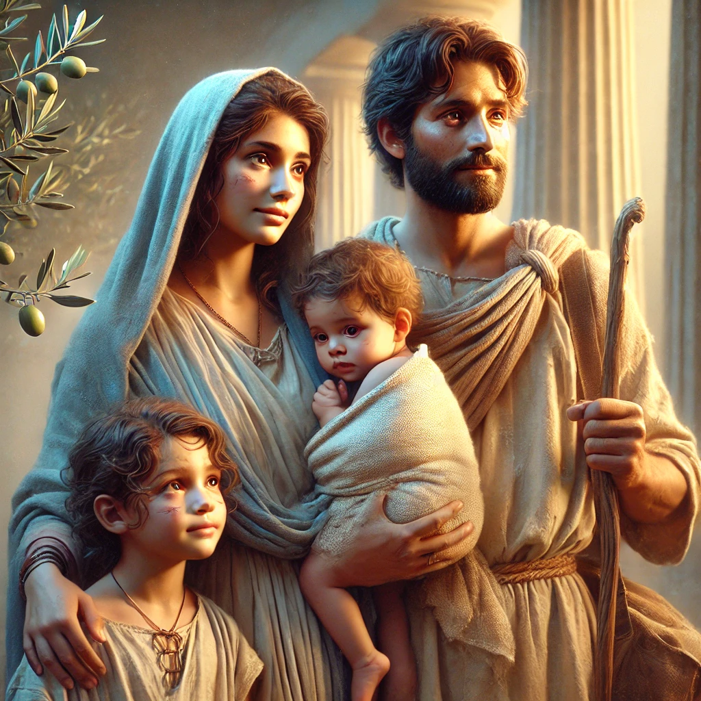 Dusty but unbroken, a small family of exiles pauses at the gates of the sanctuary. The mother cradles the future in her arms, the father stands guard with quiet strength, and the children — wide-eyed — carry the memory of home and the promise of return.