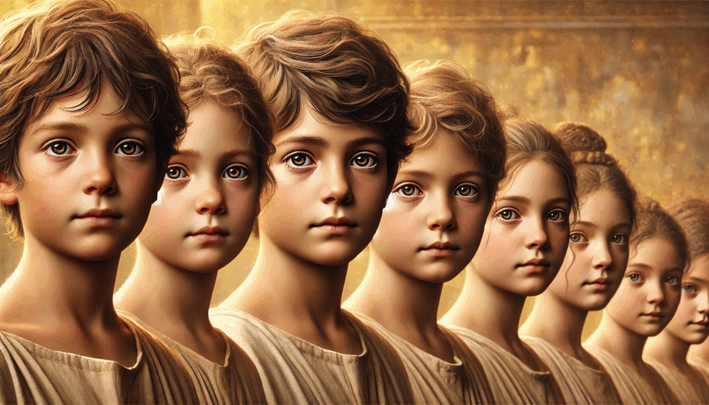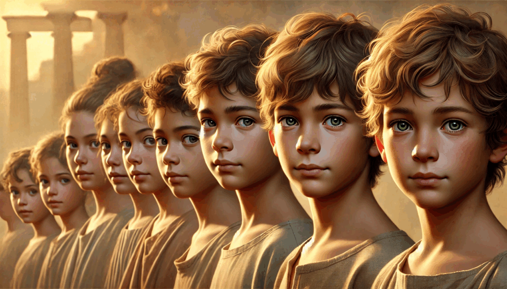 Hand in hand, two children return with their families to a city once lost. Lit by olive leaves and golden morning light, their wonder and innocence mirror the rebirth of Athens itself — a quiet joy that outlives conquest.