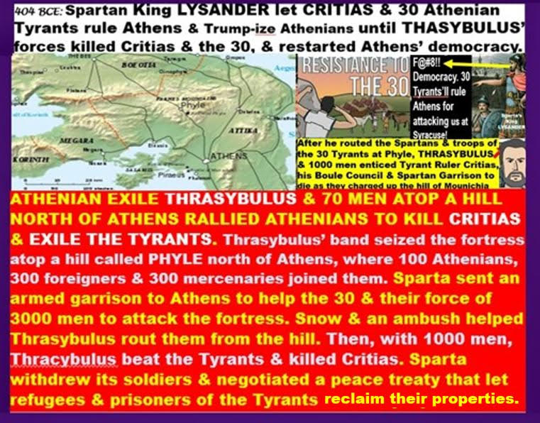 Each of the 30 Tyrants chose a foreign resident who had property in Athens, took the foreigner’s property & killed him. Sound familiar, Americans?