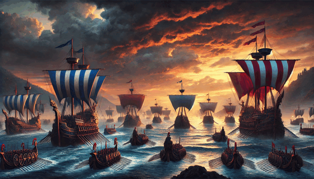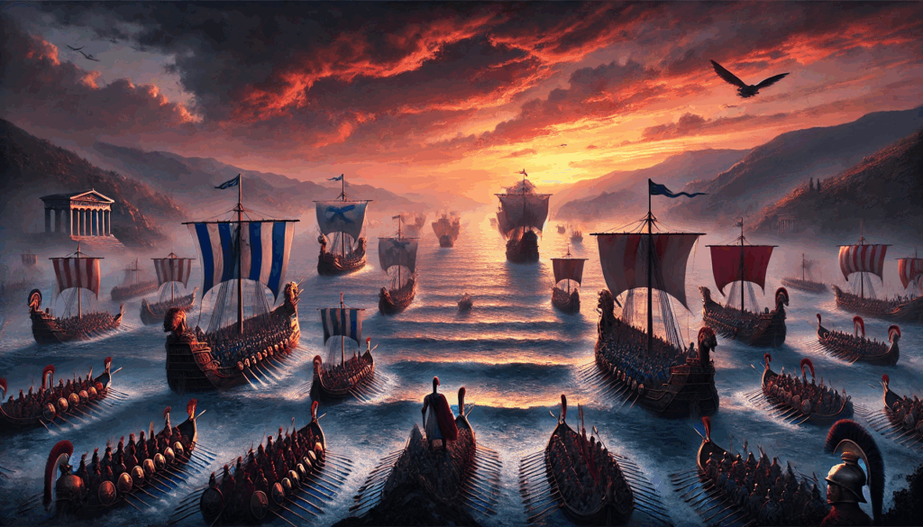 The Spartan fleet, led by Admiral Lysander, dominates the horizon with red sails and bronze prows, poised to crush Athens’ last defense under the fading light of a dramatic sky.
