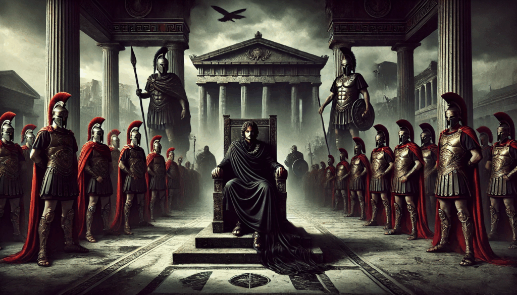 This image captures Critias at the height of his power, seated on a throne as ruler of Athens under Spartan control. His expression is sharp and unyielding, reflecting the cold intellect and ruthless authority with which he led the Thirty Tyrants. Behind his composed exterior lies the terror he unleashed — purging citizens, seizing property, and silencing dissent — all under the shadow of Spartan spears. The golden laurel signals legitimacy, but his gaze reveals the iron grip of oligarchy.