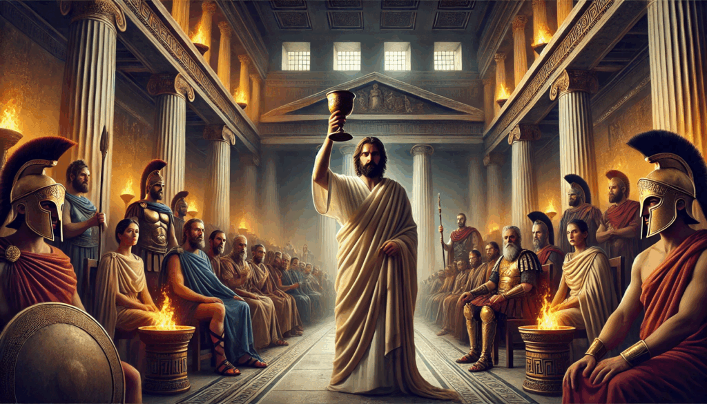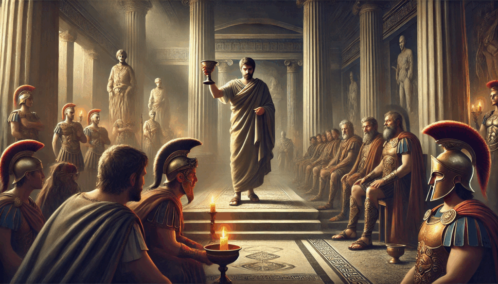 In the marble shadows of Athenian tyranny, Theramenes raises the cup with stoic defiance. Around him, the Thirty Tyrants and Spartan guards watch in silence — a moment thick with judgment and fate.
