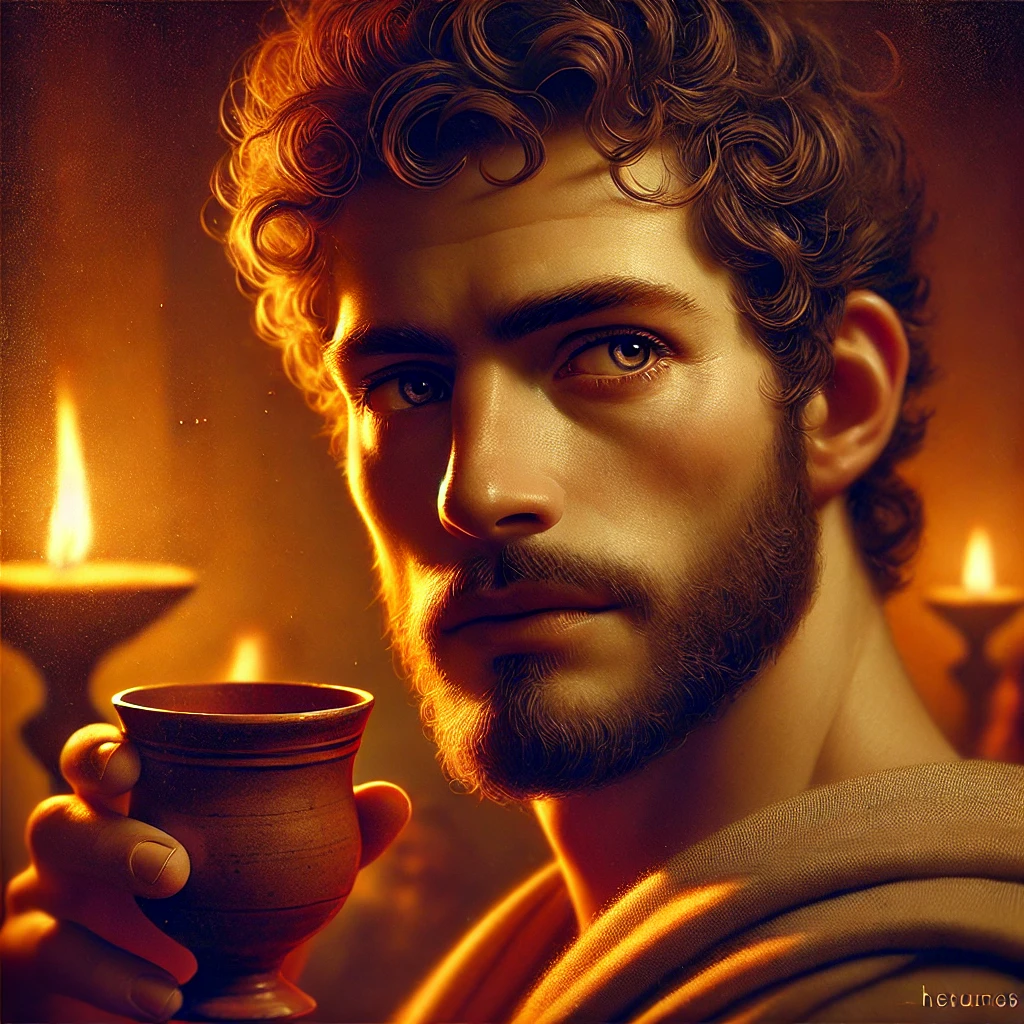 His eyes fixed in calm defiance, Theramenes lifts the cup not in fear but with the quiet triumph of a man who knows history will outlive his killers. The shadow of Critias lingers — but it is Theramenes who owns the moment.