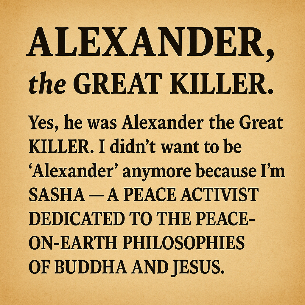 Yes, he was Alexander the Great KILLER. I didn’t want to be “Alexander” anymore because I’m SASHA — a peace activist dedicated to the Peace-on-Earth philosophies of Buddha and Jesus.