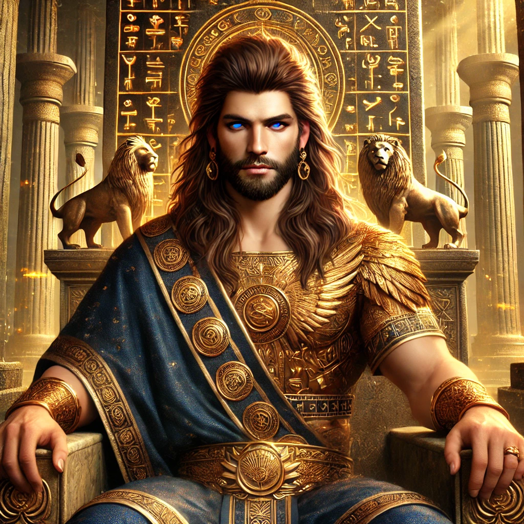 MARDUK: KING OF GODS, MASTER OF DESTINY Seated upon his golden throne, Marduk radiates supreme authority and divine presence. His piercing blue eyes and calm expression speak of ancient wisdom and unwavering command. Clad in richly adorned armor and royal blue robes, he embodies balance between might and order. The lions at his side—symbols of dominance and protection—stand guard as sacred inscriptions and cosmic sigils illuminate his celestial reign. This is the god who shaped the cosmos from chaos, ruling not with brute force, but with visionary power and eternal justice.