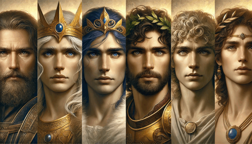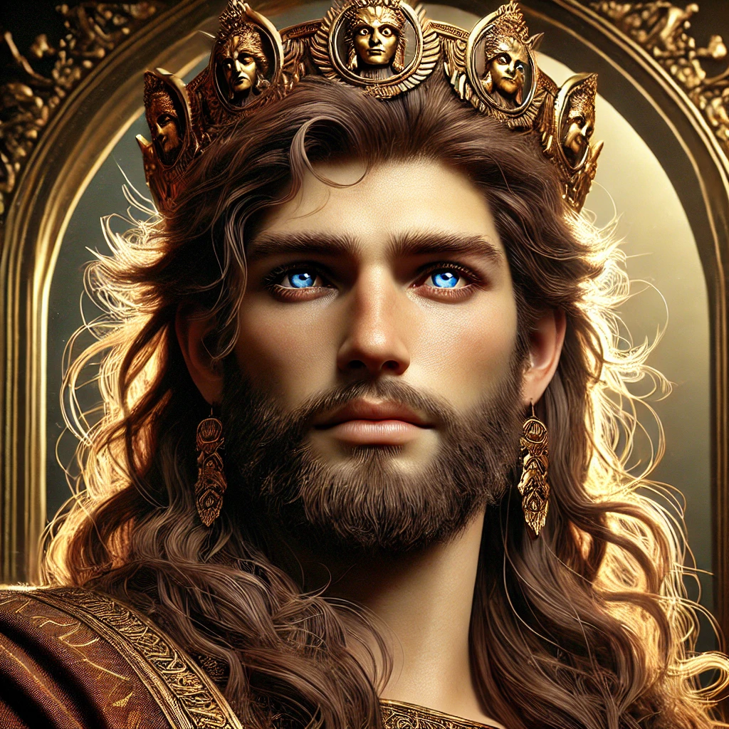 MARDUK: LORD OF BABYLONIAN GLORY This portrait captures Marduk in a moment of serene command. His flowing brown hair and radiant blue eyes symbolize divine vision and clarity. The crown, adorned with Babylonian motifs, speaks to his sovereignty over gods and men. Golden light illuminates his noble features, reflecting both wisdom and quiet power—the unmistakable aura of a creator and king.