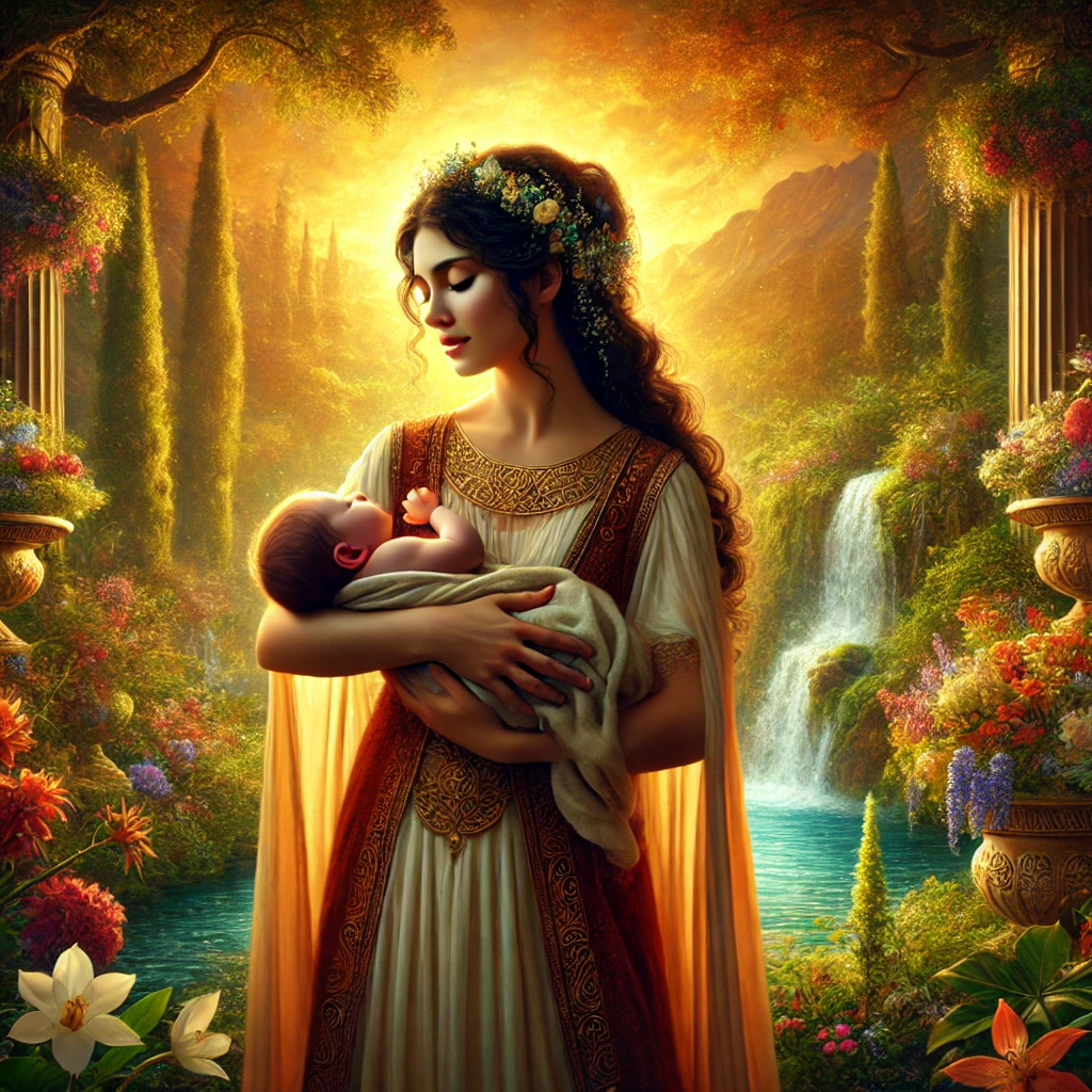 MORNING OF THE GOLDEN CHILD Bathed in the light of dawn, Olympias cradles her newborn son in a garden where heaven and earth meet. Her gaze is soft, her strength unshaken, surrounded by waterfalls, blossoms, and the hush of divine peace. The child stirs in her arms, wrapped in warmth and prophecy. No gods walk here now—only a mother and her son, alive in a world that blooms just for them. In this sacred stillness, destiny begins not with thunder, but with a breath, a bloom, a bond.