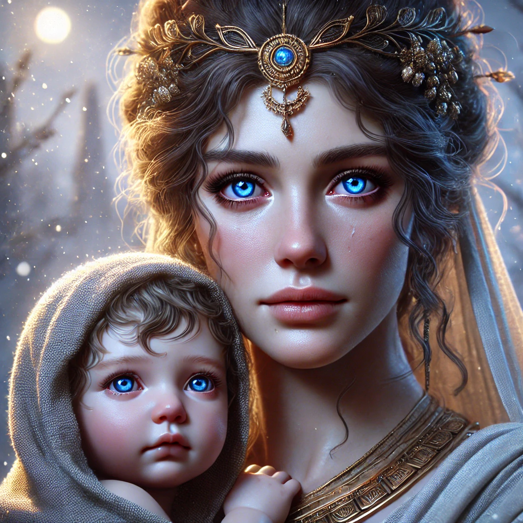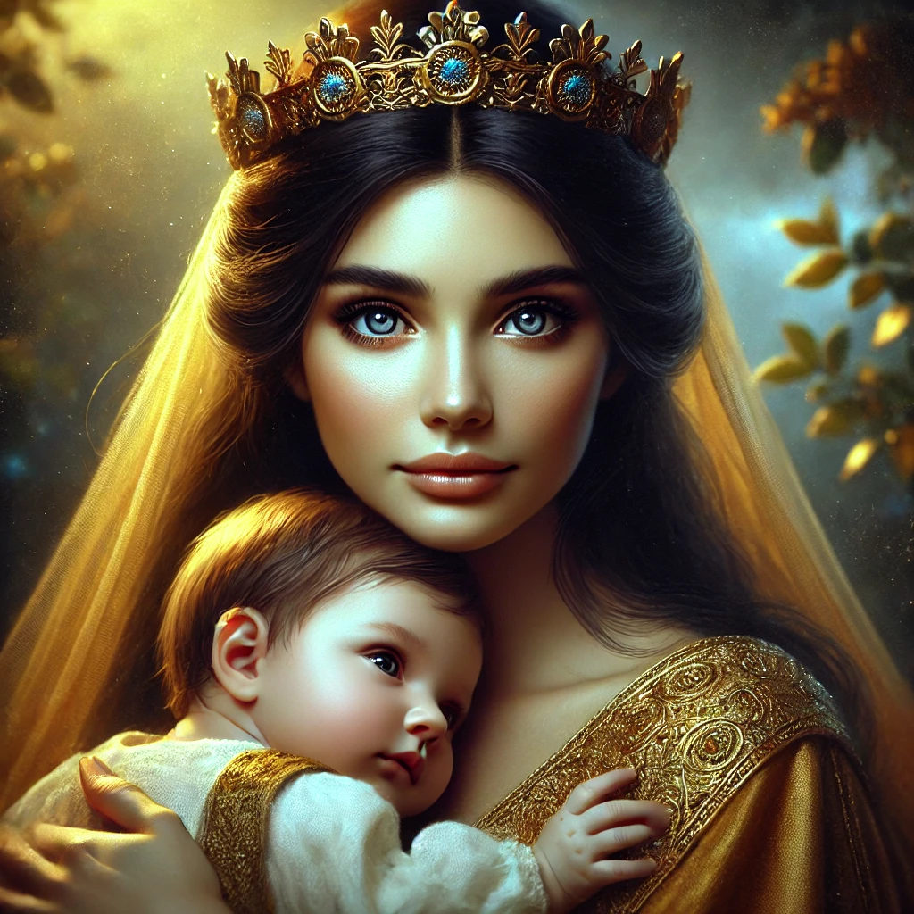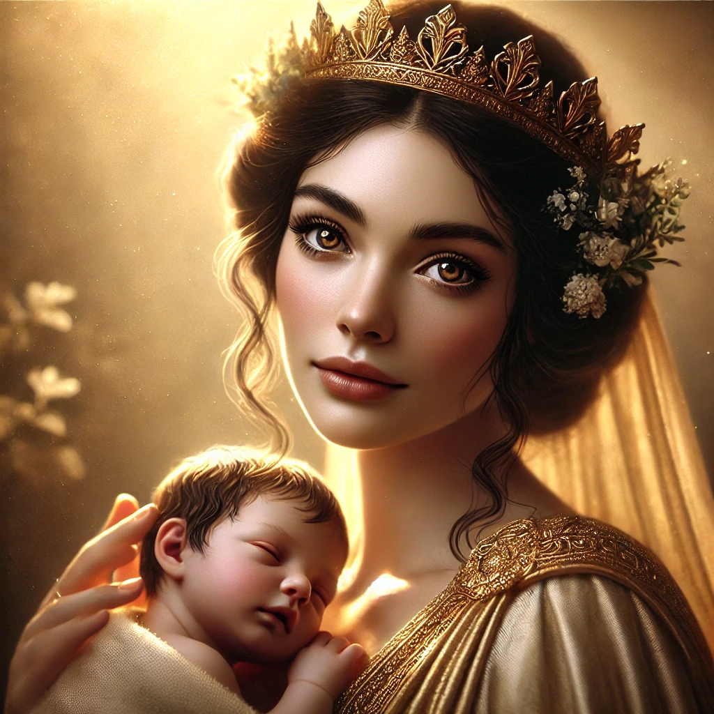 THE QUEEN AND HER PROMISED SON In the hush between stars and prophecy, Olympias holds her child close to her heart. Her crown gleams not just with jewels, but with the weight of destiny. Blue eyes unshaken, she gazes forward—not with fear, but with knowing. Wrapped in golden robes, the infant Alexander rests safely against her, his tiny hand already reaching for a world that will one day know his name. In this quiet, radiant moment, the future cradles the future.