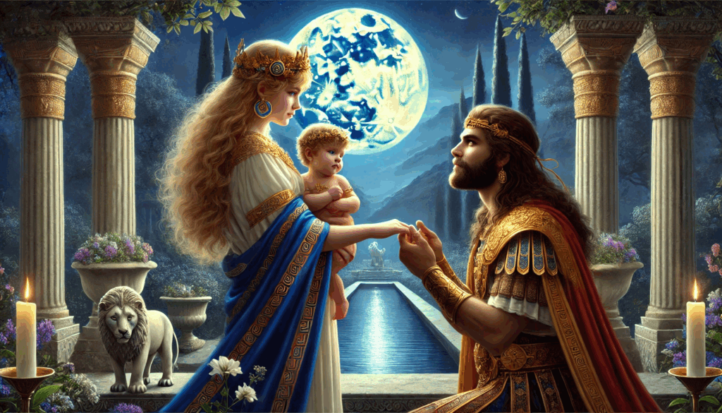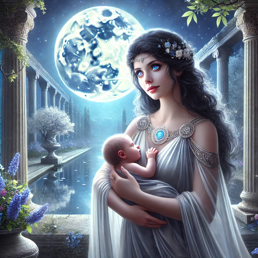 OLYMPIAS AND ALEXANDER: BENEATH THE MOON’S BLESSING Bathed in silvery moonlight, Olympias cradles her newborn son beneath a sky filled with stars and destiny. The garden glows around her—flowers blooming in the quiet of night, water shimmering like ancient glass. Her blue eyes are soft with devotion, her arms a cradle of strength and warmth. In this moment, all is still, as if nature itself holds its breath in reverence of a future king born under divine watch.