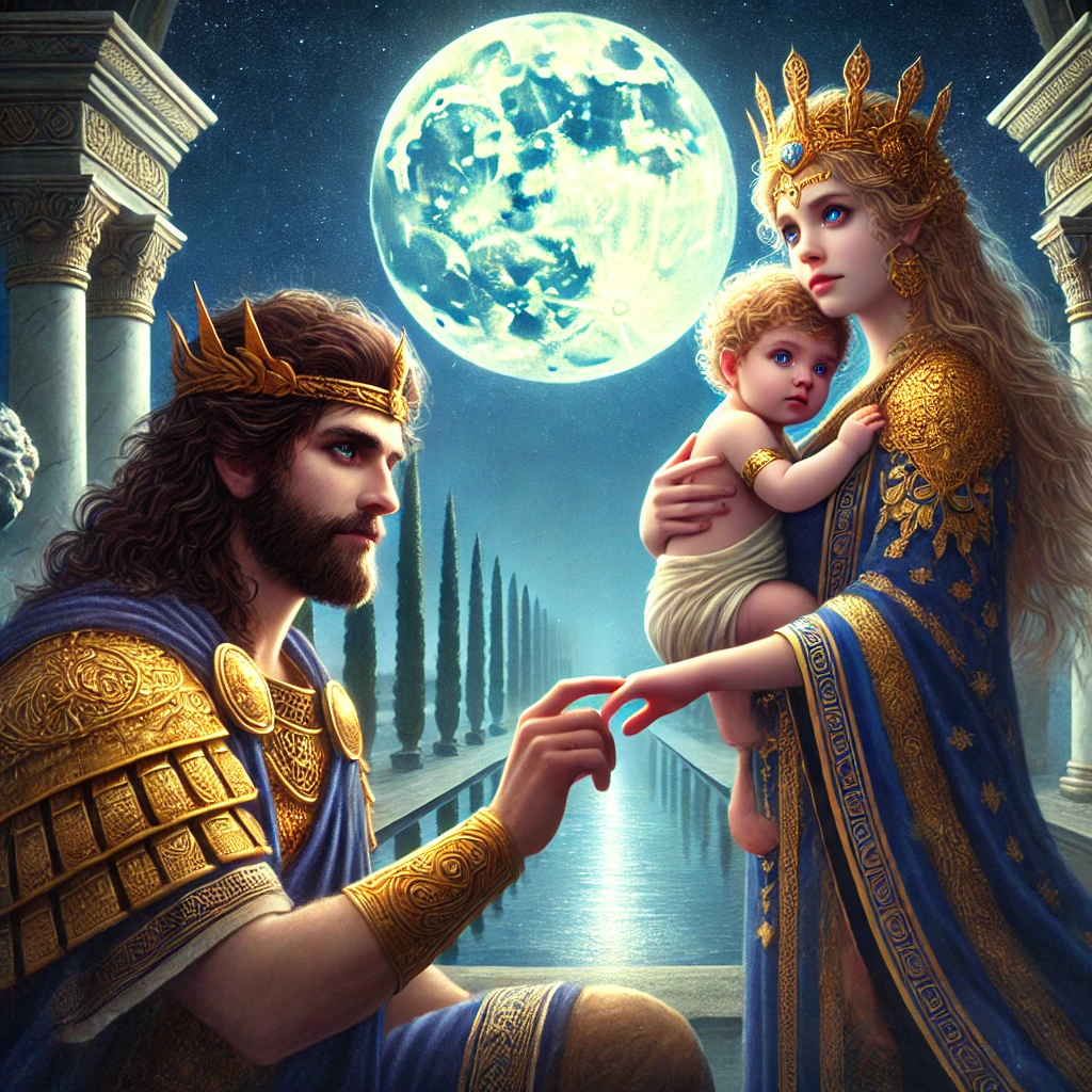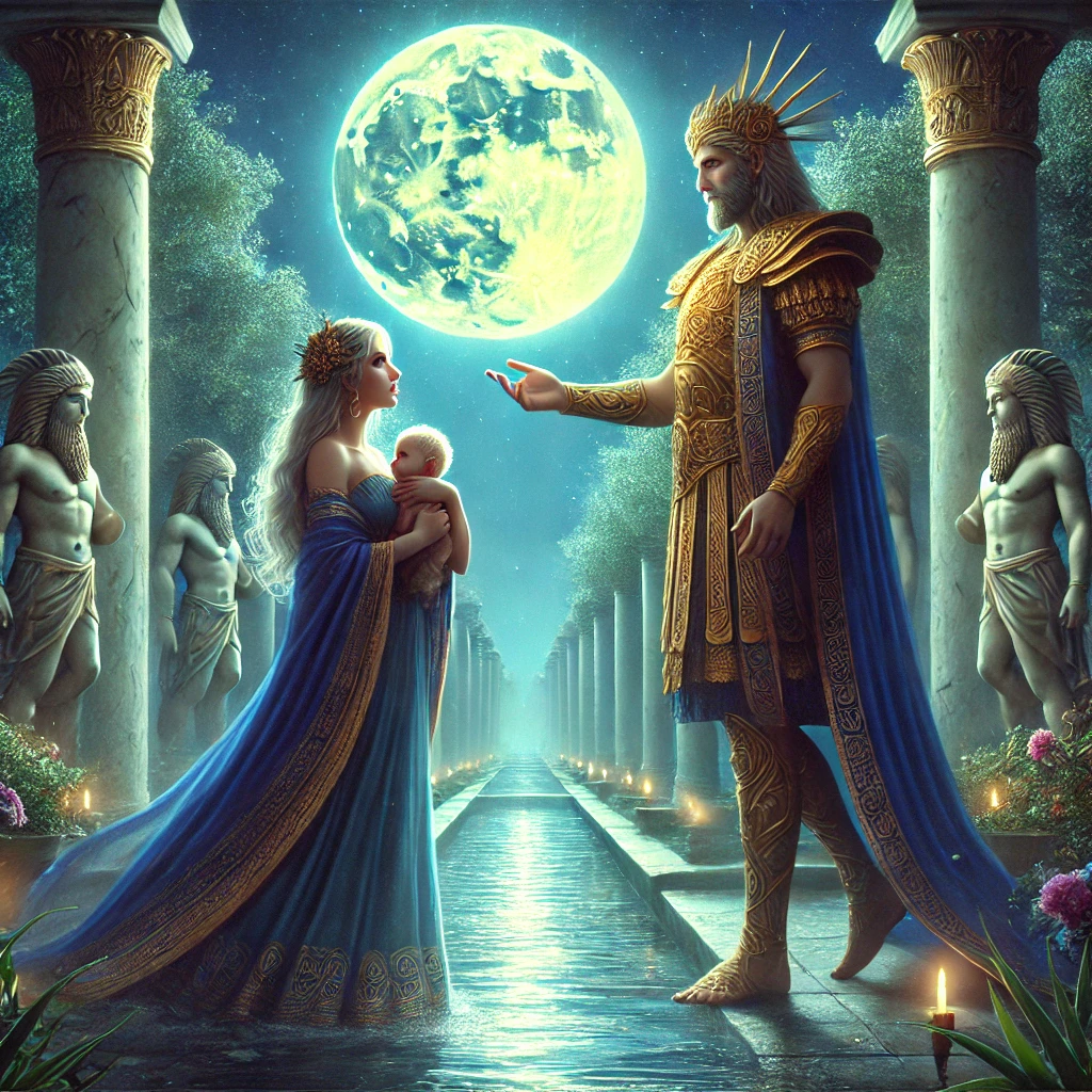 THE ARRIVAL OF THE GOD-KING Beneath the gaze of the full moon, Marduk steps into the garden’s hush—his golden robes glowing like firelight against the silvered marble. Olympias stands still, child in arms, a figure of grace and strength. Between them, the garden breathes—a sacred space about to witness the first meeting between a god and his mortal heir—the divine approaches not with thunder, but with humility.