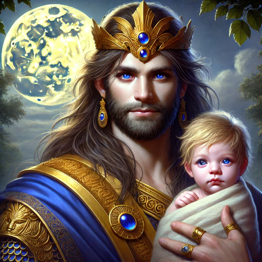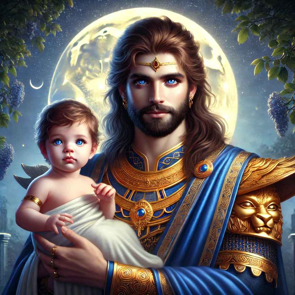 HEIR OF HEAVEN, SON OF EARTH Marduk holds his child with quiet pride, his piercing blue eyes locked with yours. In his arms rests Alexander, serene and glowing, blue eyes wide in innocent wonder. Beneath a sky of stars and prophecy, god and infant become one image of legacy, power, and the bond that shapes empires—a moment caught between the eternal and the now.