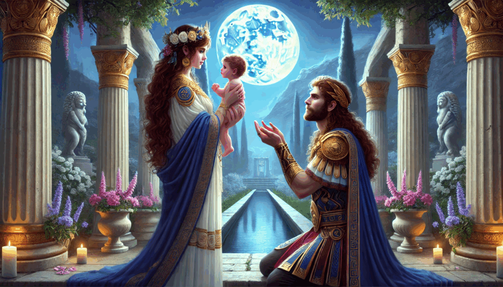 THE GIFT OF DESTINY In the stillness of the moonlit garden, Olympias lifts her child toward Marduk—her hands steady, her gaze unwavering. The god, radiant in celestial armor and gold, receives his son with reverent awe. The garden glows not from moonlight alone, but from the sacredness of this moment: the passing of a legacy from mortal love to divine purpose.