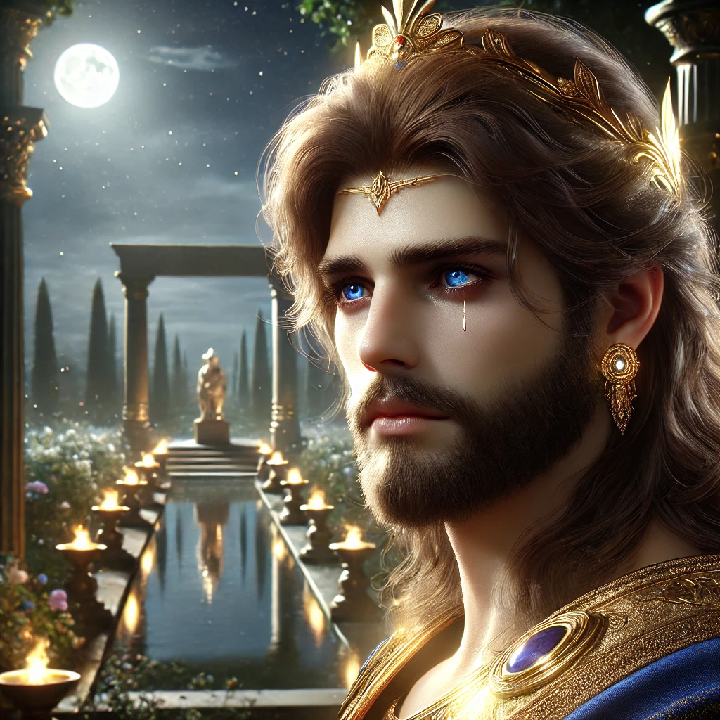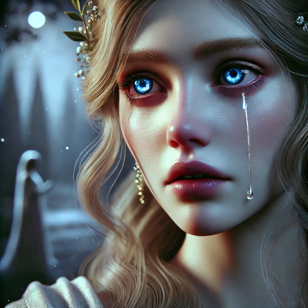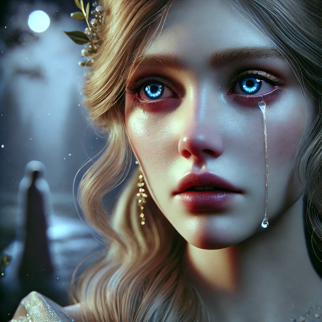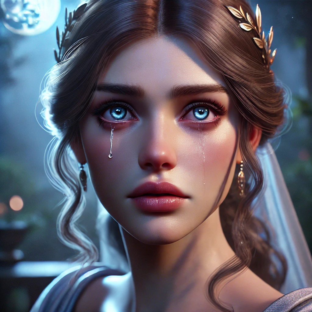 OLYMPIAS: TEARS FOR THE GOD WHO LOVED HER In the hush of a garden where gods walk only briefly, Olympias turns her gaze to the stars. Her blue eyes glisten, not with weakness, but with the weight of what was given—and what must be let go. She does not beg, nor regret. She mourns the silence that follows the sound of parting footsteps. A single tear falls for a love that may never return, but never truly leaves.