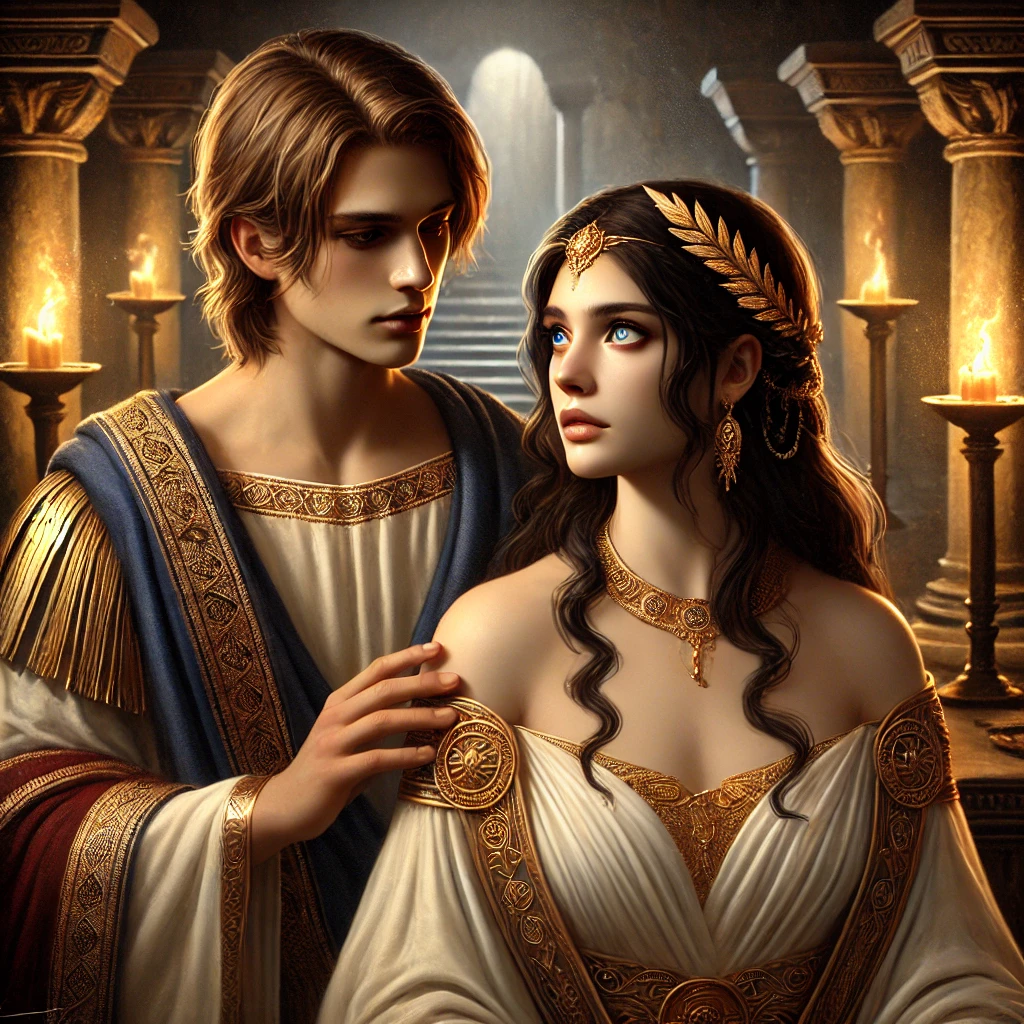 MARDUK & OLYMPIAS: WHEN TITANS FALL IN LOVE Bathed in golden light within an ancient temple, Marduk and Olympias stand face to face—his divine armor catching the glow, her ethereal gown whispering against the marble floor. Her dark curls and golden adornments shimmer with grace, while his eyes soften in reverence. This moment captures not only romance, but awe: a god known for dominion and judgment now captivated by the strength and mystery of a mortal queen. Together, they are myth and magnetism—eternal and unforgettable.