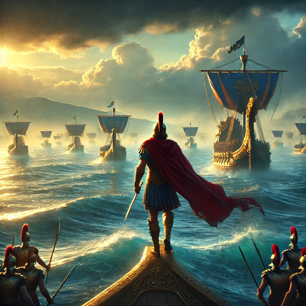 THE CROSSING TO EMPIRE The wind carried more than sails. It carried prophecy. Alexander stood at the prow, his crimson cape trailing like a war banner, the Anatolian coast rising in the mist ahead. Behind him, thousands rowed in rhythm—not toward battle, but toward legacy. The son of Marduk crossed not just water that day, but the threshold into legend.