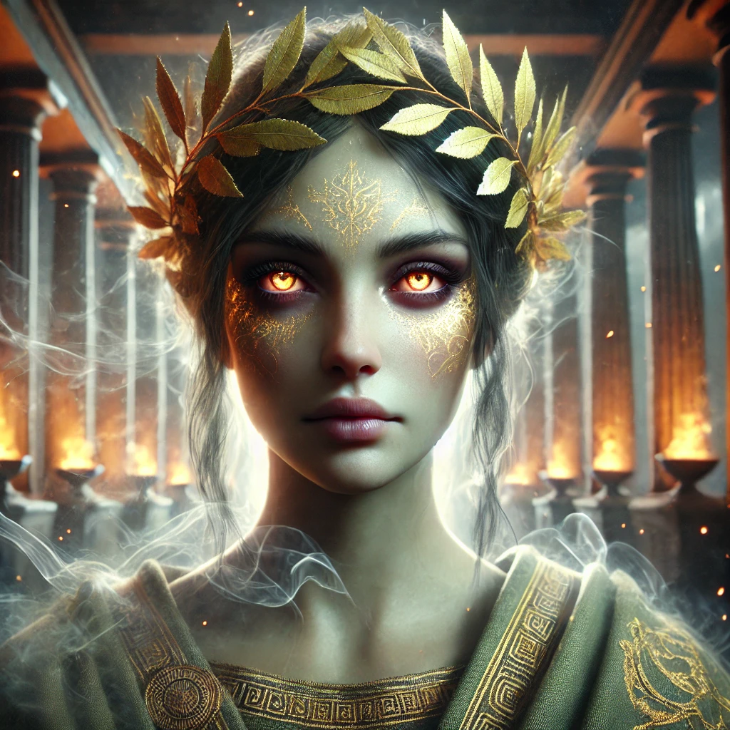 THE VOICE OF THE GOD She does not speak with her voice, but with Apollo’s. Cloaked in mist and crowned in laurel, the Pythia sees what kings cannot. Her gaze pierces veils of time. In her stillness is thunder, in her breath, fate. Those who dare ask her questions must be ready to bear the answers.