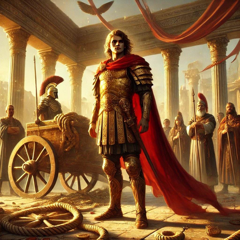 THE KNOT UNDONE The rope lies split, not with struggle, but with certainty. Alexander stands over the remnants, sword sheathed, gaze steady. The priests watch, the soldiers whisper, the wind shifts. He did not untie the knot—he ended the question. In that act, not of defiance, but of destiny, the East opened its gates to the West.