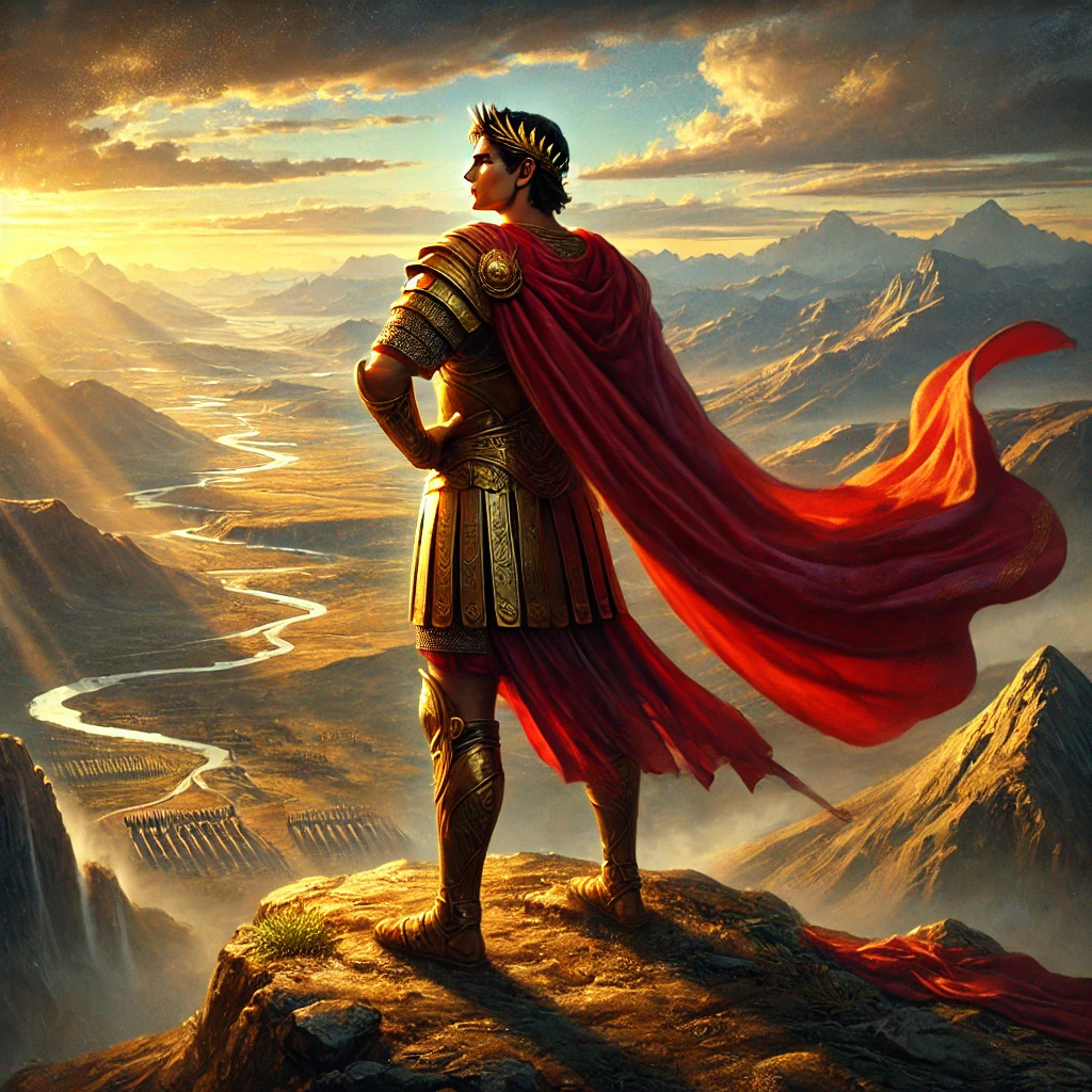 THE WORLD WITHIN HIS REACH From this height, he could see everything—rivers winding like veins, cities like jewels, mountains like gods asleep. He had crossed deserts, crushed kings, carved empires. And yet, in the quiet blaze of dawn, Alexander stood not as conqueror, but as a man. Alone. Looking out at all he had taken, and wondering what remained.