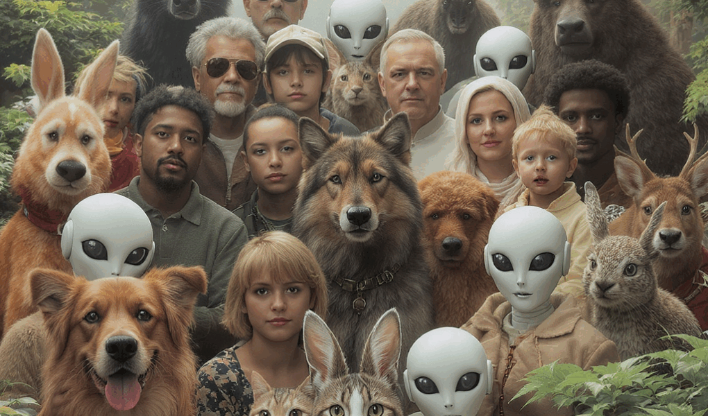 A diverse gathering of beings poses like a family portrait or class photo, all looking directly at the camera. Humans of many ages and ethnicities stand alongside animals, an android, and an extraterrestrial, their faces precise and expressive. The image captures a symbolic moment in time when all forms of life come together as equals, united by kindness.