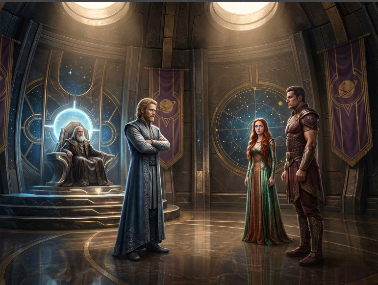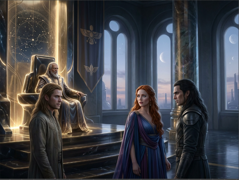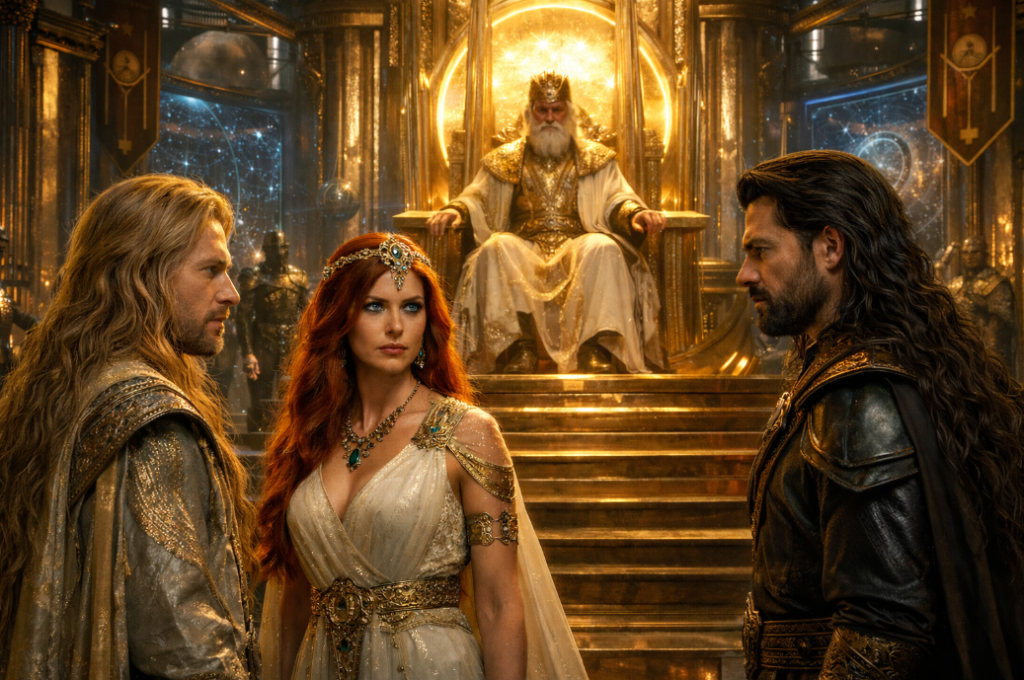 A cinematic photorealistic scene inside the royal court of Nibiru. King Anu sits high on a radiant throne as Enki, Enlil, and Princess Ninmah stand below in visible tension. Ninmah is beautiful and regal with long red hair and blue eyes. Enki is fair, blondish, wise, and intense. Enlil is handsome, authoritative, and proud. The atmosphere is charged with dynastic conflict, succession politics, and family betrayal. Rich celestial architecture, glowing metallic walls, star maps, royal banners, and a sense of ancient interplanetary empire. Realistic, photorealistic, cinematic lighting, soft natural colors, fantasy realism, highly detailed, emotional depth, artistic composition, landscape 16:9, full color.