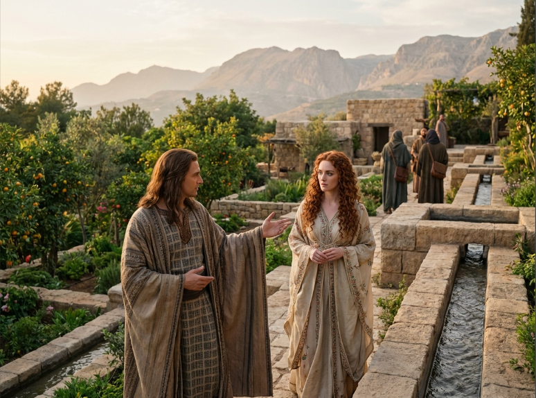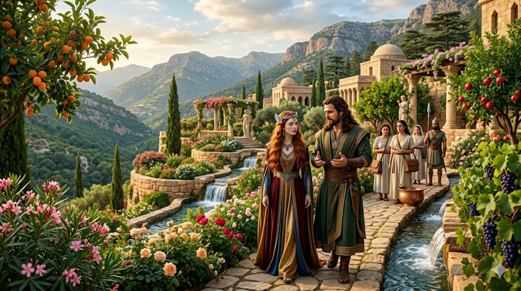 A cinematic, photorealistic landscape scene in ancient Lebanon. Enlil leads Ninmah through lush gardens and terraces fed by flowing water. Ninmah has long red hair, blue eyes, and a noble, wary expression. Enlil, long, brown hair, appears charismatic, powerful, and intent on winning her back. In the background are fruit trees, stone architecture, distant mountains, and attendants from Ninmah’s medical team. The scene should convey political seduction, ambition, and emotional tension. Realistic, photorealistic, cinematic lighting, soft natural colors, fantasy realism, highly detailed, emotional depth, artistic composition, landscape 16:9, full color.