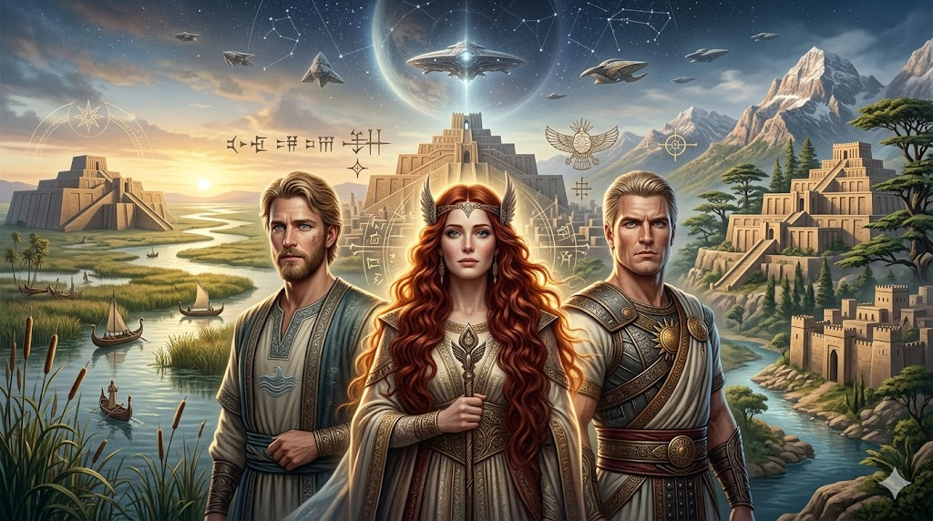 A sweeping cinematic photorealistic landscape collage illustrating the dynastic struggle of the Anunnaki royal house. At center, Princess Ninmah stands regal and luminous, with long flowing red hair, blue eyes, and an expression of wisdom, sorrow, and strength. To one side stands Enki, fair-featured, blondish hair, short beard, blue eyes, intelligent and emotionally intense. On the other side stands Enlil, powerful, commanding, handsome, fair-haired, stern and ambitious. Behind them rises a majestic vision of Nibiru’s royal courts blending into ancient Earth landscapes: ziggurats, mountains, rivers, Lebanon, Dilmun, and the Abzu marshlands. Above them, stars, celestial symbols, and subtle spacecraft suggest a cosmic dynasty descending into earthly conflict. Mood: mythic, emotionally charged, ancient, revelatory. Realistic, photorealistic, cinematic lighting, soft natural colors, fantasy realism, highly detailed, emotional depth, artistic composition, landscape 16:9, full color.