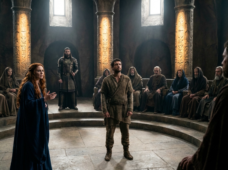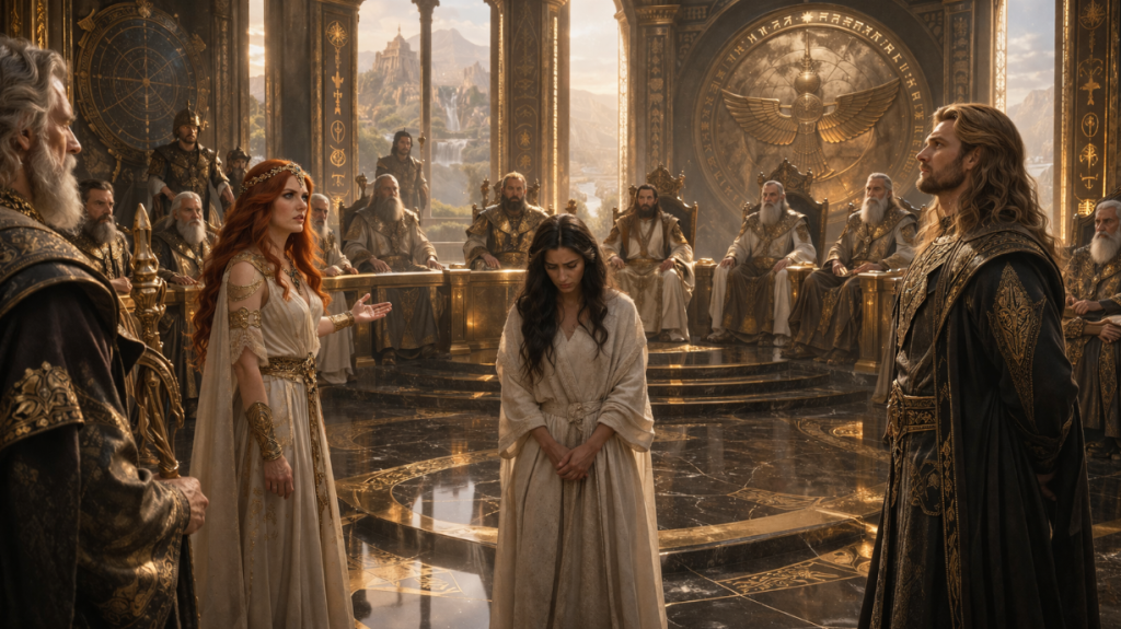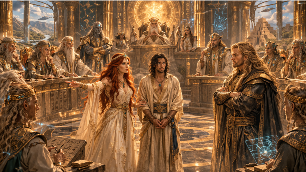 A dramatic cinematic photorealistic tribunal scene. Sud stands in the center, vulnerable but dignified, before a semicircle of powerful Anunnaki judges. Ninmah, with long, red hair and blue eyes, stands nearby in righteous fury, defending her assistant. Enlil stands apart, proud yet under accusation. The setting is an ancient high council chamber with glowing columns, polished stone, ceremonial robes, and a solemn atmosphere of judgment. Mood: grave, intense, morally charged. Realistic, photorealistic, cinematic lighting, soft natural colors, fantasy realism, highly detailed, emotional depth, artistic composition, landscape 16:9, full color.
