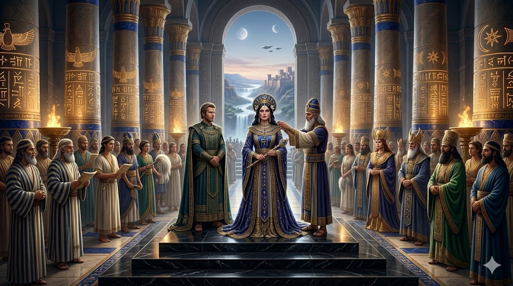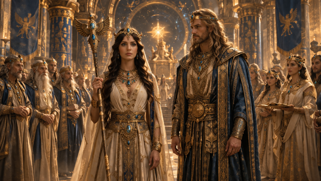 A cinematic, photorealistic coronation-style scene in which Sud is elevated as Ninlil, Lady of Command. She stands in royal garments, her expression dignified and complex, carrying both pain and restored status. Enlil stands beside her in formal attire. Priests, attendants, and members of the royal household witness the union. The setting is stately and ceremonial, with luminous gold, lapis accents, and ancient Mesopotamian-inspired design. Mood: solemn, political, bittersweet, majestic. Realistic, photorealistic, cinematic lighting, soft natural colors, fantasy realism, highly detailed, emotional depth, artistic composition, landscape 16:9, full color.