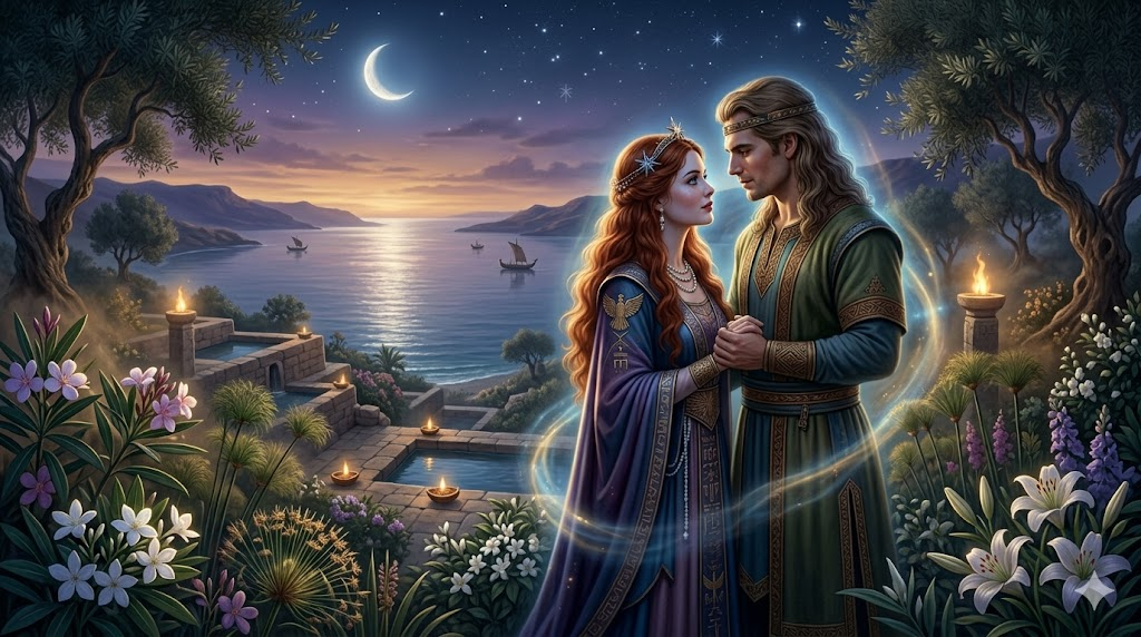 In Dilmun, Ninmah and Enki reunite in a union portrayed as sacred, sensual, and fated across eternity.