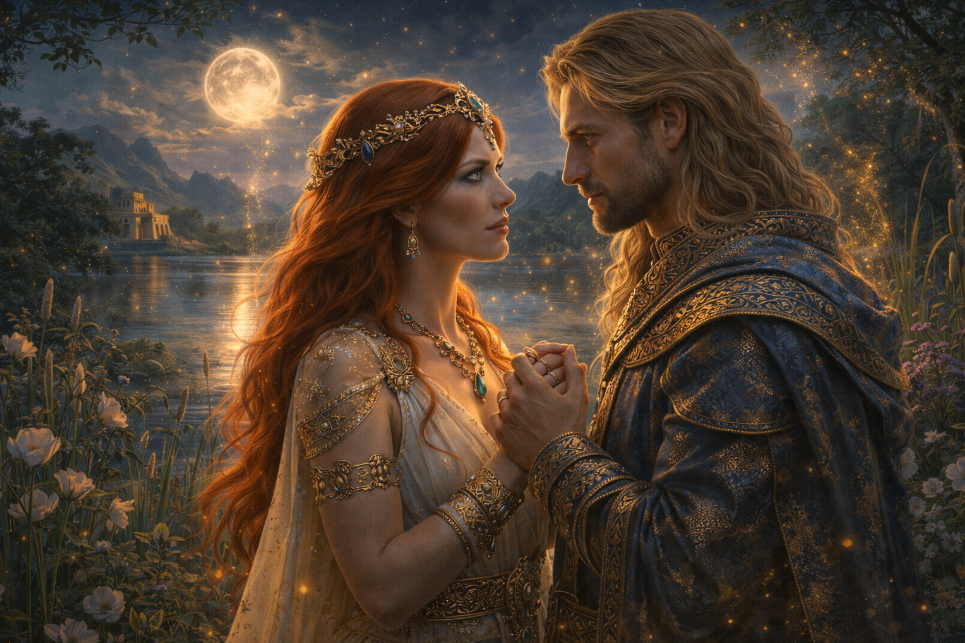 A romantic, mystical cinematic photorealistic scene in Dilmun near the Sinai Peninsula. Ninmah and Enki stand together at twilight in a lush sacred garden near water. Ninmah has long red hair and blue eyes; Enki is fair, blondish, long hair, noble, and deeply emotional. They face one another with tenderness and cosmic recognition, surrounded by reeds, flowering plants, moonlit water, and a subtle auric glow that suggests timeless soul connection. Mood: sacred reunion, longing fulfilled, sensual yet elegant, cosmic love. Realistic, photorealistic, cinematic lighting, soft natural colors, fantasy realism, highly detailed, emotional depth, artistic composition, landscape 16:9, full color.