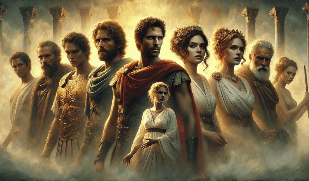 They do not speak. They do not move. They look across time, across legend, across truth. Diomedes stands with Aeneas, Cassandra beside Hecuba, and Aphrodite among them — no longer above, but equal. Their faces reflect what was felt and what cannot be undone: the gods can bleed, the veil has torn, and the myth has changed. This is the gaze of those who saw it happen — and will not forget.