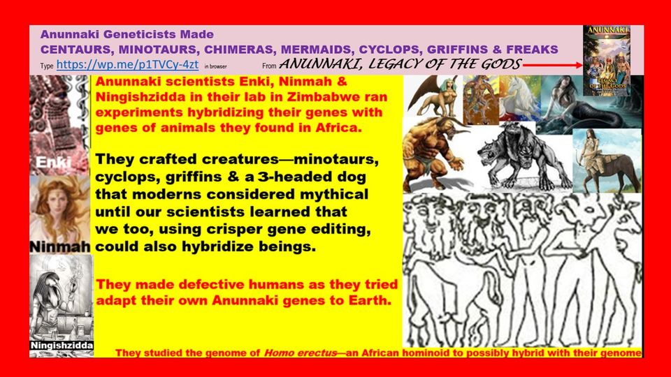 Lucifer, sister LILITH (Ninmah), Chief Medical Officer and THOTH (Ningiszidda) (Enki’s son with Persephone-Ereshkigal) retreated to his lab in Zimbabwe, where the team conducted genetic experiments. They made freaks—“men with two wings, with one body and two heads, with mixed male and female organs, with legs and horns of goats and other hominid-animal mixtures.”