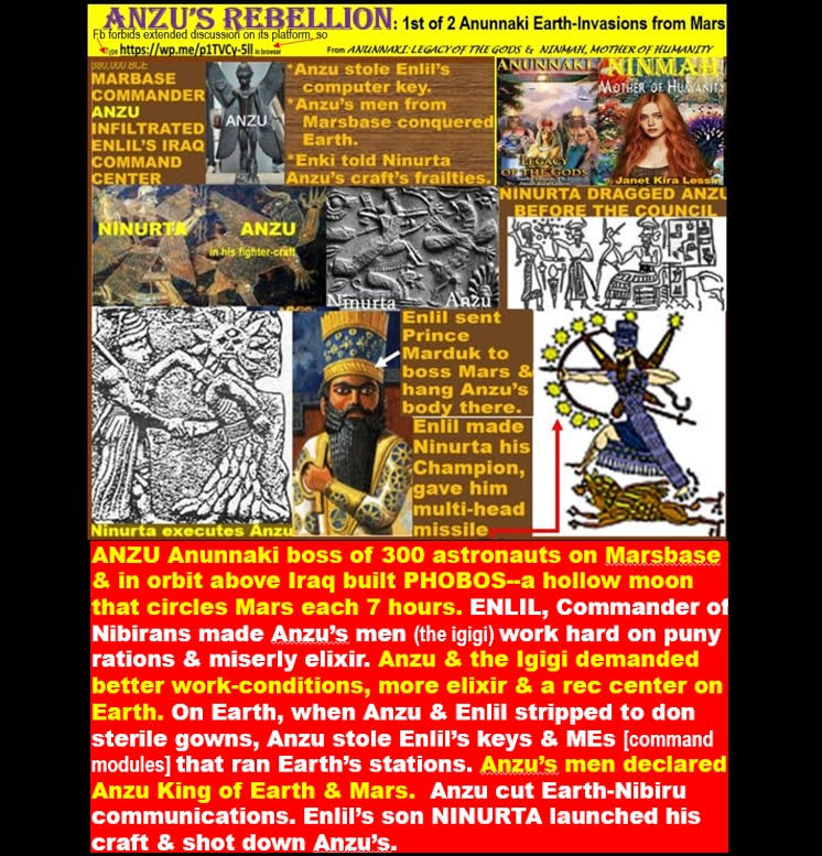 Anzu, leader of the lineage of deposed Nibiran King Alalu, ruled 300 shuttle-service astronauts—the Igigi–on Marsbase as well as those in orbit above Iraq. He had his men build & place PHOBOS, an artificial, potato-shaped hollow moon, 6000k from Mars’ surface. Phobos circles Mars every 7 hours. [The missile that, in modern times, destroyed NASA Phobos probe may’ve been part of defenses the Anunnaki left on Mars.]
