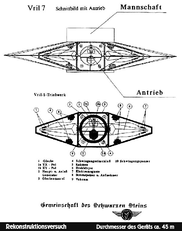 It was supposed by some, including the Hermetic Order of the Golden Dawn, that Lytton’s book was not altogether a work of fiction. Some claimed that Lytton was privy to secrets of antediluvian worlds. A secret inner order of psychics was soon developed, known as the Vril Society. They based their name on the power source “vril” that is mentioned prolifically throughout Lytton’s book. The Thule and Vril Societies channeled beings from Aldebaran to gain the secrets of the “vril” power. What ensued thereafter, were the specifications pictured to the right:[10]