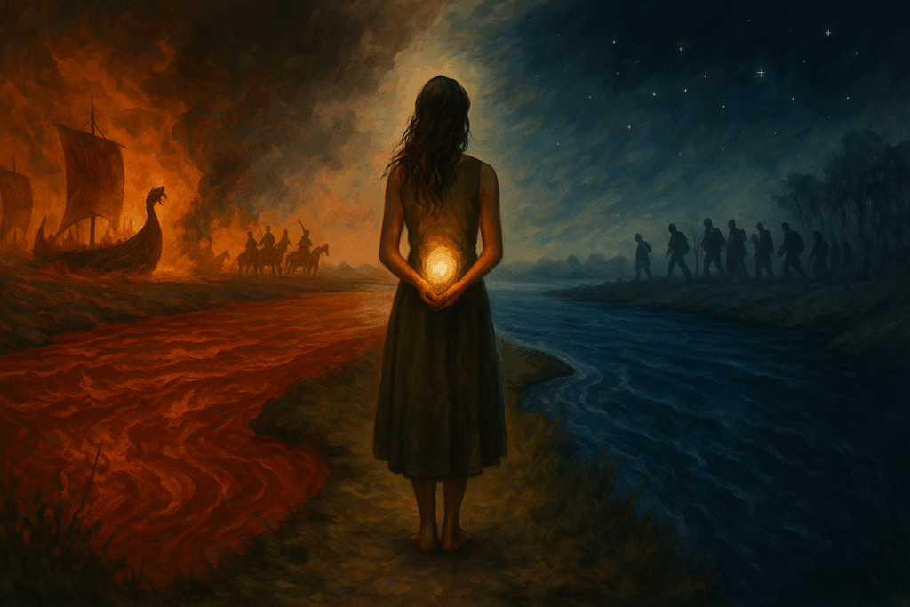 A wide-format version of the “Two Rivers” concept shows the woman from behind. She stands on a narrow promontory, her long hair flowing down her back, holding the glowing orb at her spine. On the left: Viking ships, soldiers on horseback, and flames. On the right: a solemn line of silhouetted refugees under a peaceful starlit sky. The rivers—red and blue—curve beneath her, merging into a symbolic threshold.