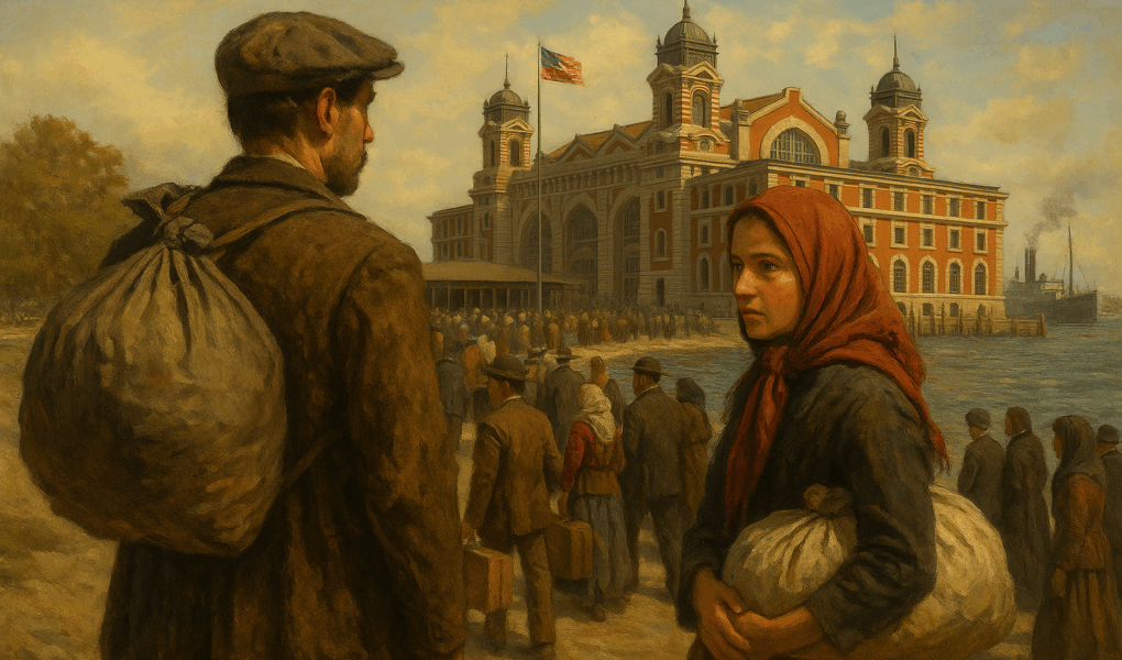 Immigrants disembark at Ellis Island beneath the rising sun. A man with a sack and a woman in a red headscarf stand in the foreground, gazing at the grand immigration station—emblems of hope, endurance, and the American dream rooted in exile.