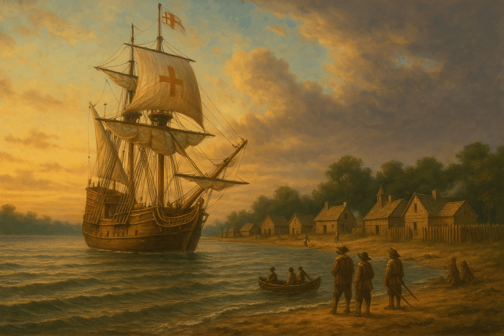 A colonial ship flying the English cross approaches the shore of Jamestown, Virginia. Armed settlers await the rowboat carrying new arrivals. The wooden structures and watchtower in the background mark the birth of a settlement and a legacy of conquest.
