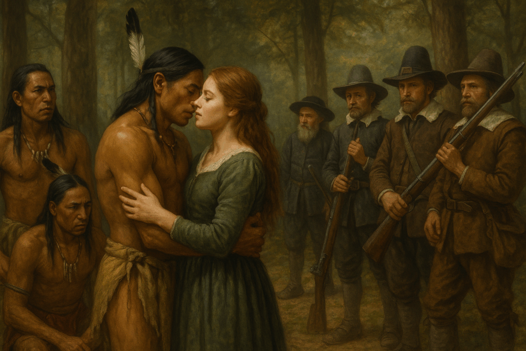 A Native American man and a European woman share an intimate moment in a forest glade while others from both cultures observe in tension or disapproval. Their love—or mutual understanding—is dangerous in a world defined by division and domination.